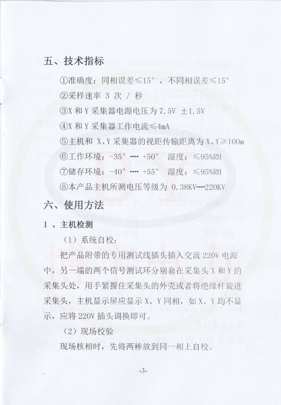 把产品附带的专用测试线插头插入交流220V电源中,另一端的两个信号测试环分别套在采集头X和Y的采集头处,用手紧握住采集头的外売或者将绝缘杆旋进采集头,主机显示屏应显示X、Y同相,如X、Y均不显示,应将220V插头调换即可。