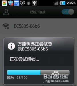1、上网搜索并下载“Wfi万能钥匙”APK程序, 2、打开手机程序列表中的“Wfi万能钥匙”,在程序主界面中点击“开启”按钮以打开手机中的Wifi开关。 3、接着程序会自动搜索周围存在的开放Wifi网络,如果搜索到,则会显示出来。点击要进行连接的无线网络,则程序自动进行连接。 4、当搜索到的周围Wifi被加密时,程序就会在Wifi列表中对应图标上显示一个“小锁”图标,以表明加密。此时点击要连接的Wifi网络,在打开的窗口中点击“用万能钥匙破解”项。 5、在破解无线网络密码的过程中,需要打开数据开关以获取无张Wifi热点信息。 6、如果此Wifi热点并没有被其它用户共享其Wifi密码,则程序就进用手机怎么破wifi密