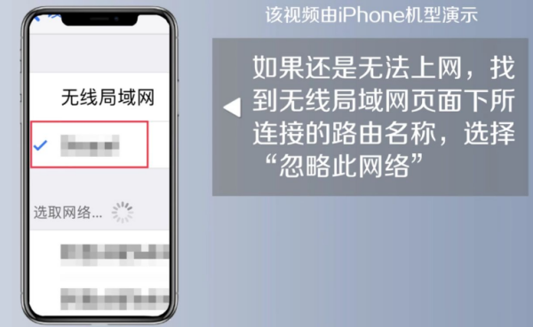 3、如果还是无法上网,找到无线局域网页面下所连接的路由器名称,选择“忽略此网络”。