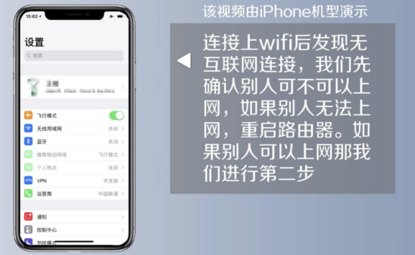 1、连接上WiFi后发现无互联网连接,先确认别人可不可以上网,如果别人无法上网,那么是路由器原因,重启路由器。