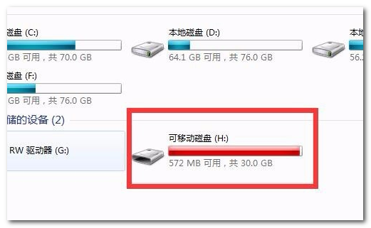 4、然后在电脑桌面上面找到‘计算机’打开,发现有一个很满的磁盘,那个就是个人的内存卡。因为已经存满了,所以显示红色。