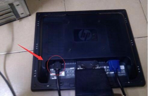 3:接下来给显示器接上电源线,(注意只是和显示器想连,电源线另一端先别接上插座,等所有连接完成后再通电。)如图:
