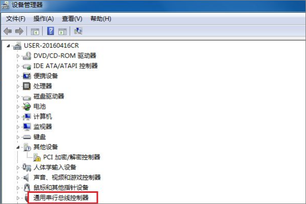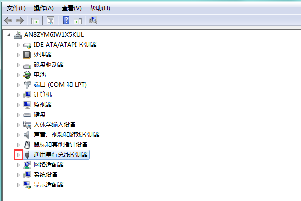 3、在“设备管理器”中,双击红框中选中的“通用串行总线控制器”按钮。