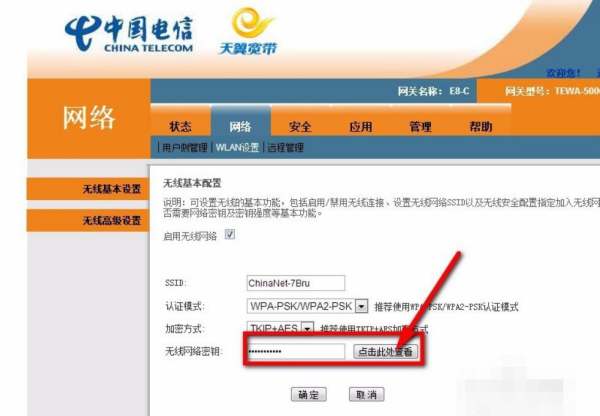 4、在“无限网络密钥”栏点击“点击此处查看”,即可查看原来的密码,修改密码的话,只需要将原密码修改成自己想要的密码即可;最后点击“确定”,即可成功修改密码。