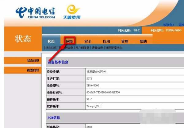3、登录成功之后就进入了【路由器主界面】,可以看到路由器的相关信息,然后点击上方的工具栏中的【网络】。