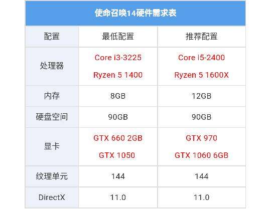 看最低配置的话,使命召唤14的要求并不高,Core i3处理器、GTX 660显卡即可,不过最低配置通常是没什么意义的,只是说能玩,而要想玩得舒服一些,不低于推荐配置的硬件平台才好,而这一点要求还是挺高的,处理器要Core i5或者Ryzen 5高端产品,内存要12GB以上,显卡要GTX 970或者GTX 1060 6GB级别的。