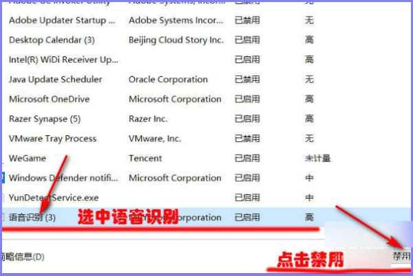 3、选中语音识别这一项,在页面右下角点击禁用。