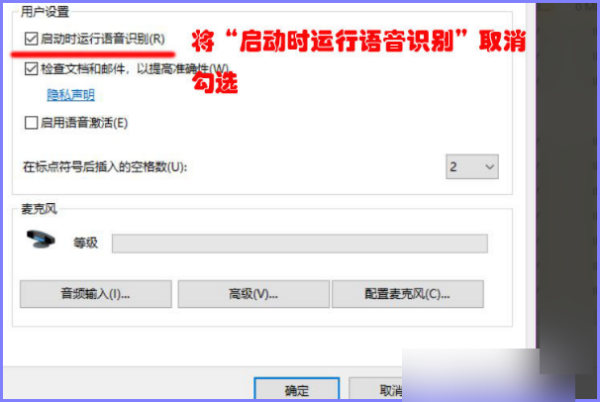 6、在语音属性窗口下,将启动时运行语音识别取消勾选,点击确定即可关闭完成。