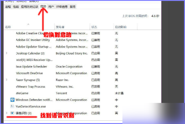 2、将选项卡切换到启动,在页面中找到语音识别。