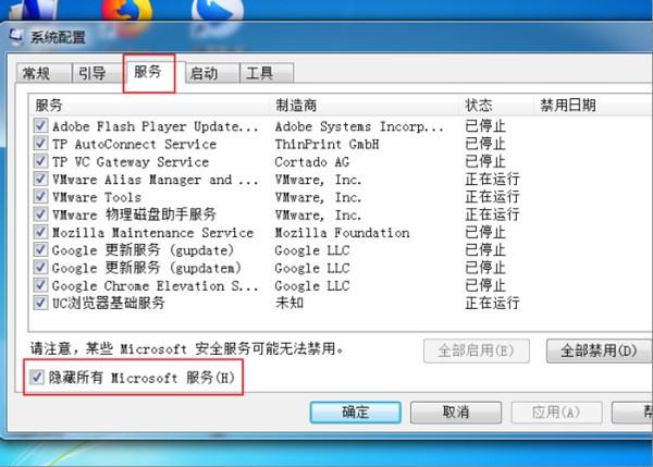 3、接着,完成上述步骤后,单击上面的“服务”选项卡,然后勾选“隐藏所有Microsoft服务”选项,如下图所示,然后进入下一步。