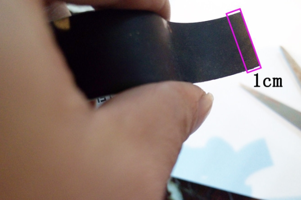 8、然后用剪刀剪下宽度约1cm左右的绝缘胶带,长度截去少许,大小等同第6步刮去的海绵大小。