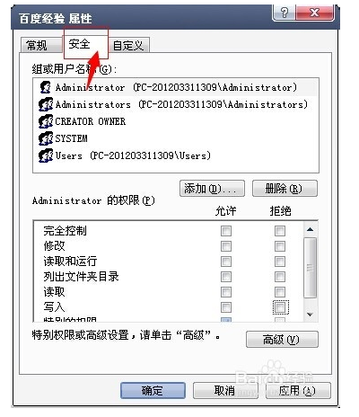3、在文件夹属性选项卡中,选择”安全“标签。