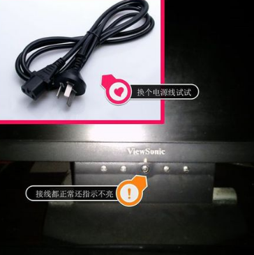 2、如果电源,插座都可以正常使用及接线都OK,可能是显示器电源线坏了,换一条显示器电源线试试