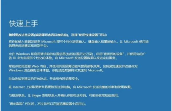14,对Win10进行个性化设置,可以直接点击右下角的“使用快速设置”来使用默认设置,也可以点击屏幕左下角的“自定义设置”来逐项安排。