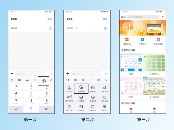 搜狗输入法:调出搜狗输入法键盘,点击左上角“S”图标,然后点击“个性皮肤”即可选择喜欢的皮肤下载使用。