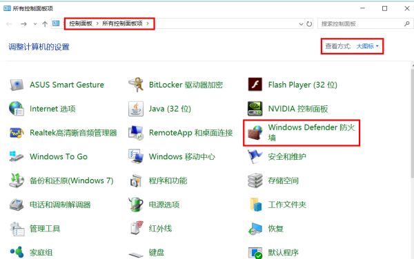 【WIN+Q】搜索并进入【控制面板】,【大图标】查看方式选择【Windows Defender防火墙】。