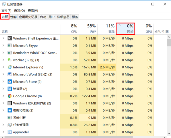 在网络卡顿时,使用【Ctrl+Alt+Del】组合键打开【任务管理器】,在【进程】中查看【网络】占用。