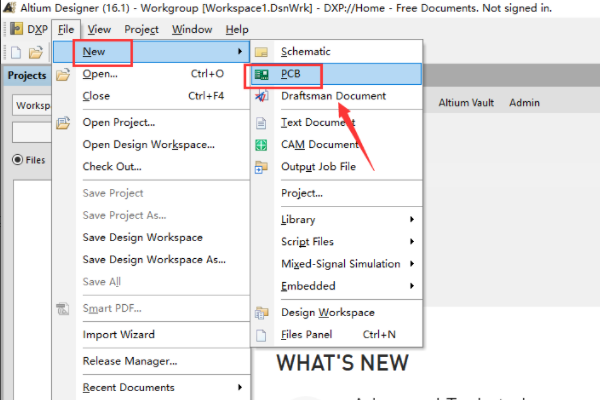 2、其次,单击file中的NEW-PCB,以创建一个新的PCB图。如下图所示,然后进入下一步。