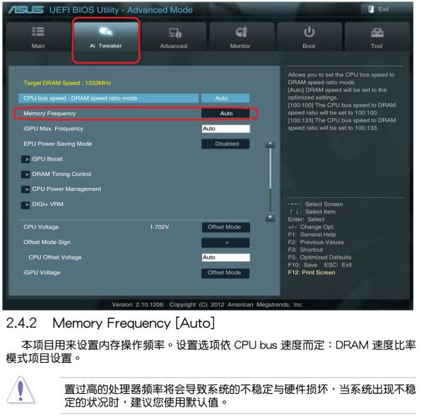 在BIOS的Ai Tweaker菜单中有一项——Memory Frequency,这个就是改变内存频率的。