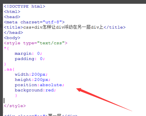 5、在css标签内,设置类名为aa的div的样式。设置其宽度为200px,高度为200px,位置属性为绝对定位,背景颜色为红色。