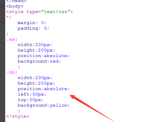 6、在css标签内,设置类名为bb的div的样式。设置其宽度为200px,高度为200px,位置属性为绝对定位,距离页面左边缘为50px,距离页面上边缘50px,背景颜色为黄色。