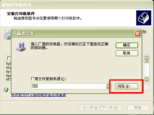6、接下来需要安装打印机的驱动程序,单击“从磁盘安装”按钮,如下图所示: