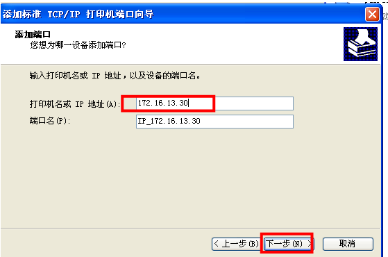 5、系统会弹出“添加端口”界面,在“打印机名或IP地址”栏中输入如下IP地址:172.16.13.30(注:端口名系统会自动填写),然后单击“下一步”按钮。