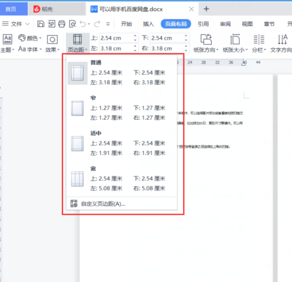 3、然后选择合适的页边距,也可以自定义,如下图所示: