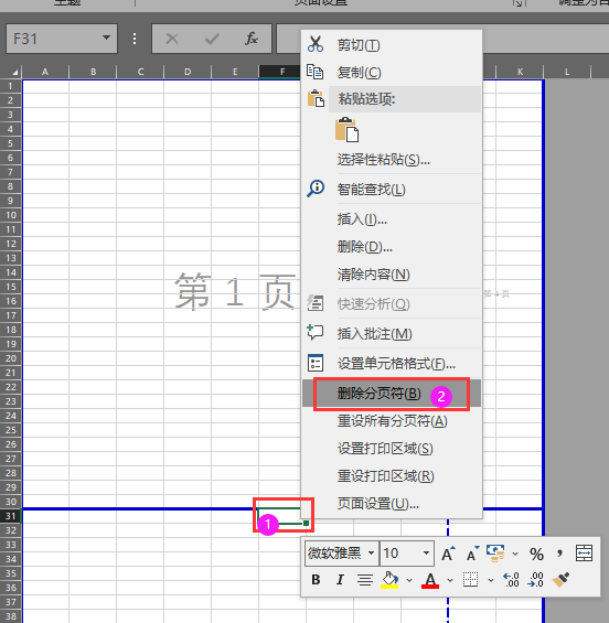 删除分页符,就会变成我给的第一张图上的自动分页的状态了,也就是成了蓝色虚线
