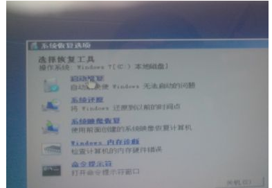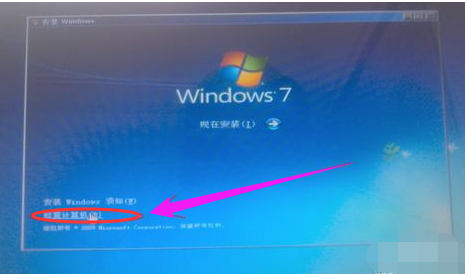 在出现安装界面时, 不要点击“现在安装”,点“修复计算机”。
