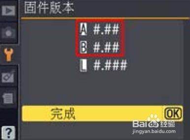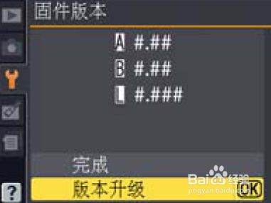 此时显示当前固件版本,确认该固件版本是本次升级的正确版本。最上面两个“#.##”代表固件版本。确认后退回设定菜单并关闭相机。