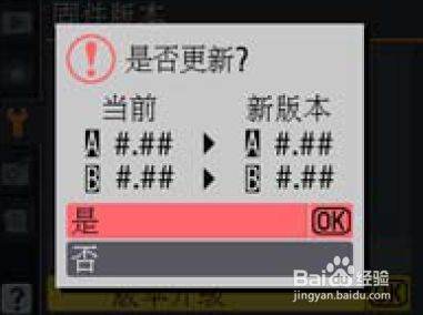 将存储卡插入相机卡槽,开启相机,按下MENU键,在设定菜单中选择固件版本。选择版本升级,并按下OK键。