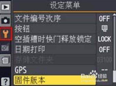 首先开启相机,确认相机电池完全充满电。按下MENU键显示菜单,在设定菜单中选择固件版本。