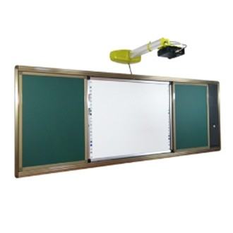 镶墙式电子白板:镶墙式需要打造暗室放置投影机,并将背投幕嵌入到墙体中,镶墙式可最大限度地节省空间,并创建一个开放的、专业的工作环境。将智能板镶在墙上,投影机放在墙里面的暗室中由背后投影,主讲人可以直接站在白板前面而不会遮住光线,背投内嵌于墙体,外置推拉式活动黑板,一体化设计,应用、保管都非常方便,本方案适用于新建学校。