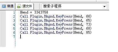 5、看到右边的代码编辑界面中66,65,7368,85分别数B,A,I,D,U的键代码,也就是ASCII码;注意一下这边的Hwnd,Hwnd这个变量用来储存鼠标所指向窗口的句柄,下面的Keypress中第一个参数就是窗口句柄,所以第一个参数全部是Hwnd;