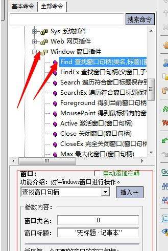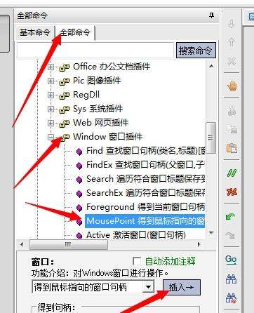 2、选择全部命令-插件命令-Window 窗口插件-MousePoint,然后点击插入此命令是用来获得鼠标所指向位置的窗口句柄;