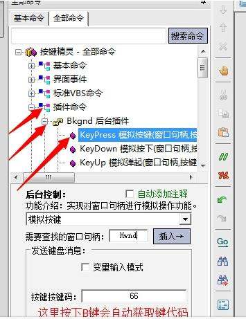 4、选择插件命令-Bkgnd 后台插件-keypress 模拟按键 (此命令是向目标窗口发送一个按键命令);在按键键代码的输入框中按下B键,自动给出数字66,然后点击插入,再依次输入A,I,D,U,继续插入;