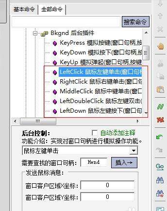 7、如果要进行鼠标点击操作的话,在插件命令中,有提供多种鼠标操作命令,比较常用的是LeftClick进行鼠标左键单击,其需要的参数第一个为目标窗口句柄,第二个就是目标窗口中所在点的X坐标,第三个则是Y坐标,说一下,这里的坐标是相对于目标窗口来说的,而不是整个屏幕,以目标窗口最左上角为起点(0,0)开始计算,到目标窗口最右下角;