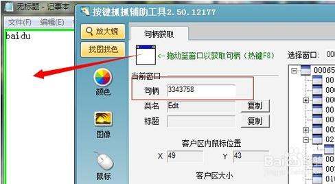 9、另外说一下,可能有人会说,如果使用鼠标所在位置的句柄的话,这样鼠标就必须指向某一窗口,这样都不算是后台操作了,这里只是演示,可以在事先给出一个值,可以用按键抓抓工具来获得目标窗口句柄,然后将句柄复制下来,比如这里记事本中输入框的句柄为3343758;