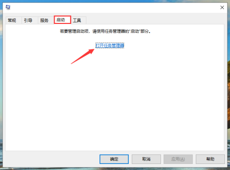 4、在系统配置窗口中,切换至“启动”选项,点击下方的“打开任务管理器”,效果跟第2步是一样的。