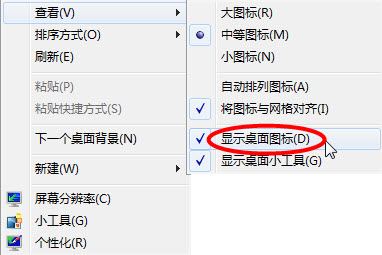 若仅仅是桌面图标不见,你可右击桌面,在XP中是选择右键菜单中的排列图标中的显示桌面图标,若是WIN7,则是选择右键菜单查看子菜单中的显示桌面图标。