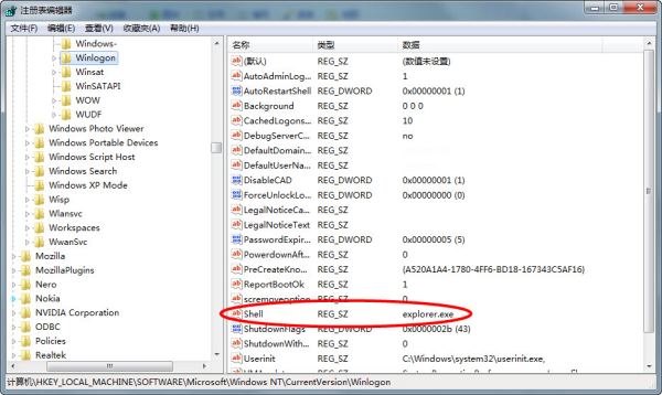 然后运行REGEDIT启动注册表编辑器,展开并定位到HKEY_LOCAL_MACHINE\SOFTWARE\Microsoft\Windows NT\CurrentVersion\Winlogon,双击Shell键值,将其值设置为Explorer.exe。