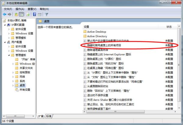 仍旧不显示的话,则按下WIN+R调出运行对话框,输入gpedit.msc启动组策略编辑器,展开“用户配置”/“管理模板”/“桌面”选项卡中双击隐藏和禁用桌面上的所有项目,设置为未配置或已禁用,然后注销一下即可。