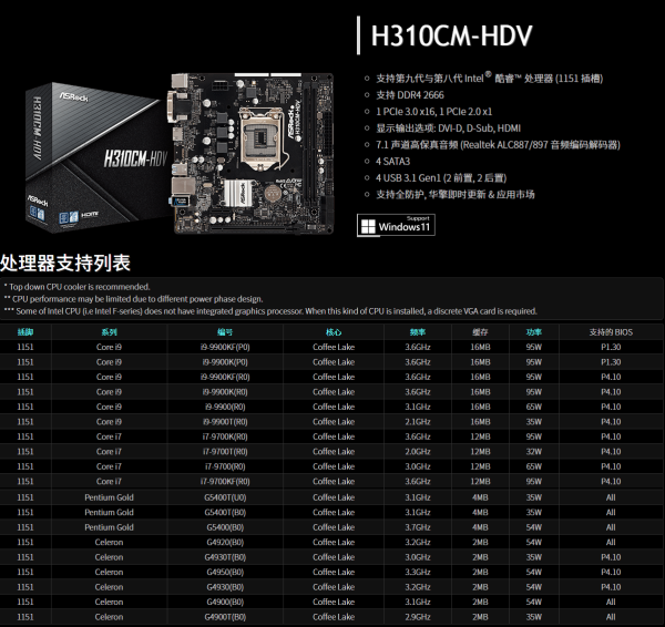 华擎h310cm支持哪些CPU支持G3930T吗?