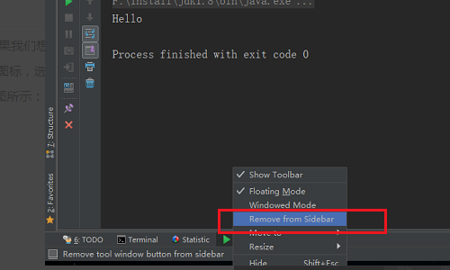 4、如果我们想关闭控制台的话,右键底部的Run图标,选择“Remove from Sidebar”。