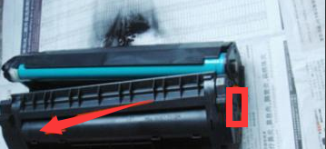 4.拆掉了一半的硒鼓就是这样。用一字起从箭头处把开始打的铁销子取出来。