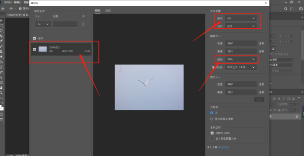 3、再有一种方法是,菜单“文件”-》"导出为“,选择“jpg”,缩放“33%”,同样是2M。