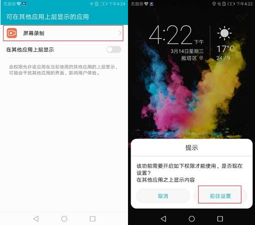 如果手机没有开启相关权限,也会导致无法录屏。请您长按音量上键和电源键2秒,会出现如下提示,点击“前往设置>屏幕录制>权限>设置单项权限”,开启启用录音和悬浮窗权限,然后尝试进行录屏操作。