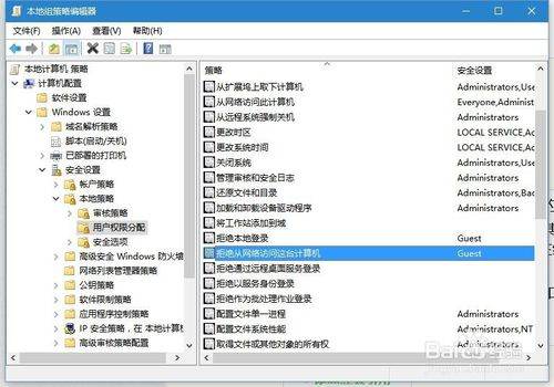 a, 在“用户权限分配”中把“拒绝从网络访问访问这台计算机”中的guest删掉;