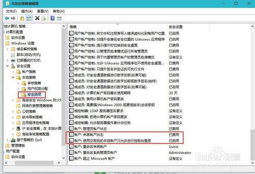 b, 在“安全选项”中把“账户:来宾账户状态”“账户:使用空密码......”的设置项均保持为“已启用”状态。